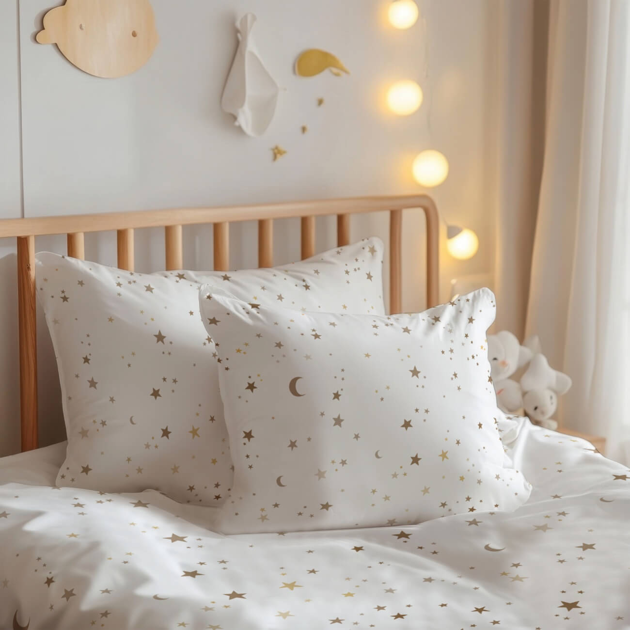 Painted stars and moons that seem to shine. 100% cotton sateen. Read more below.