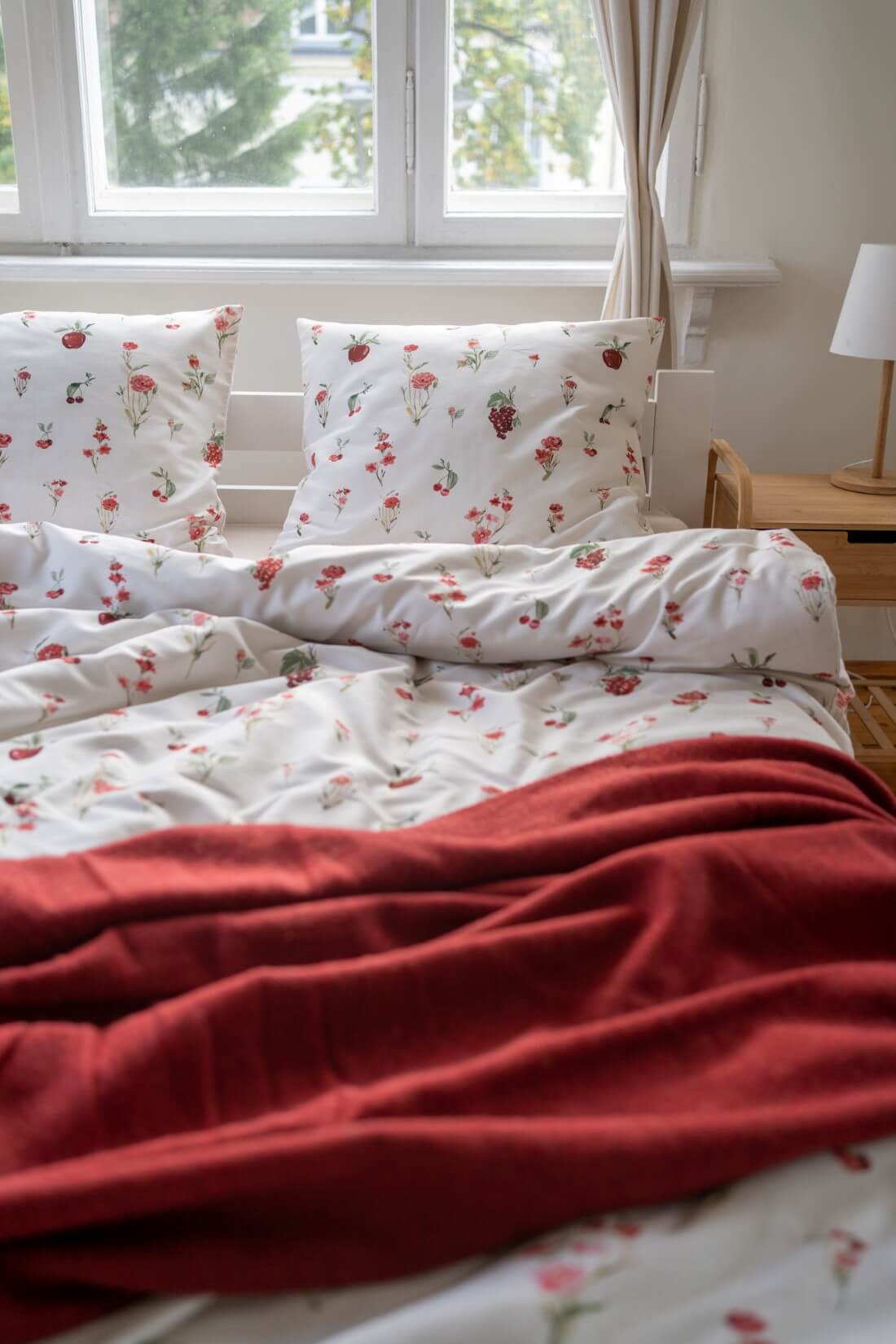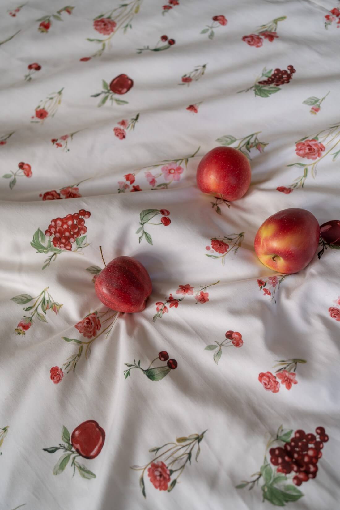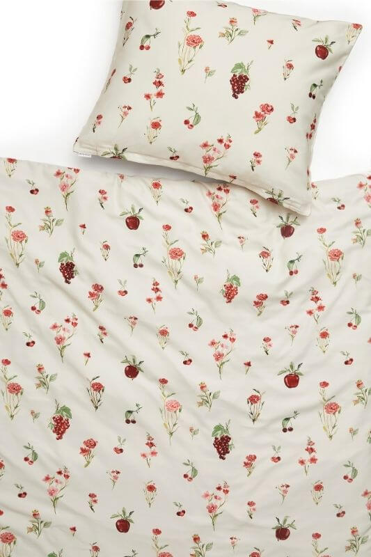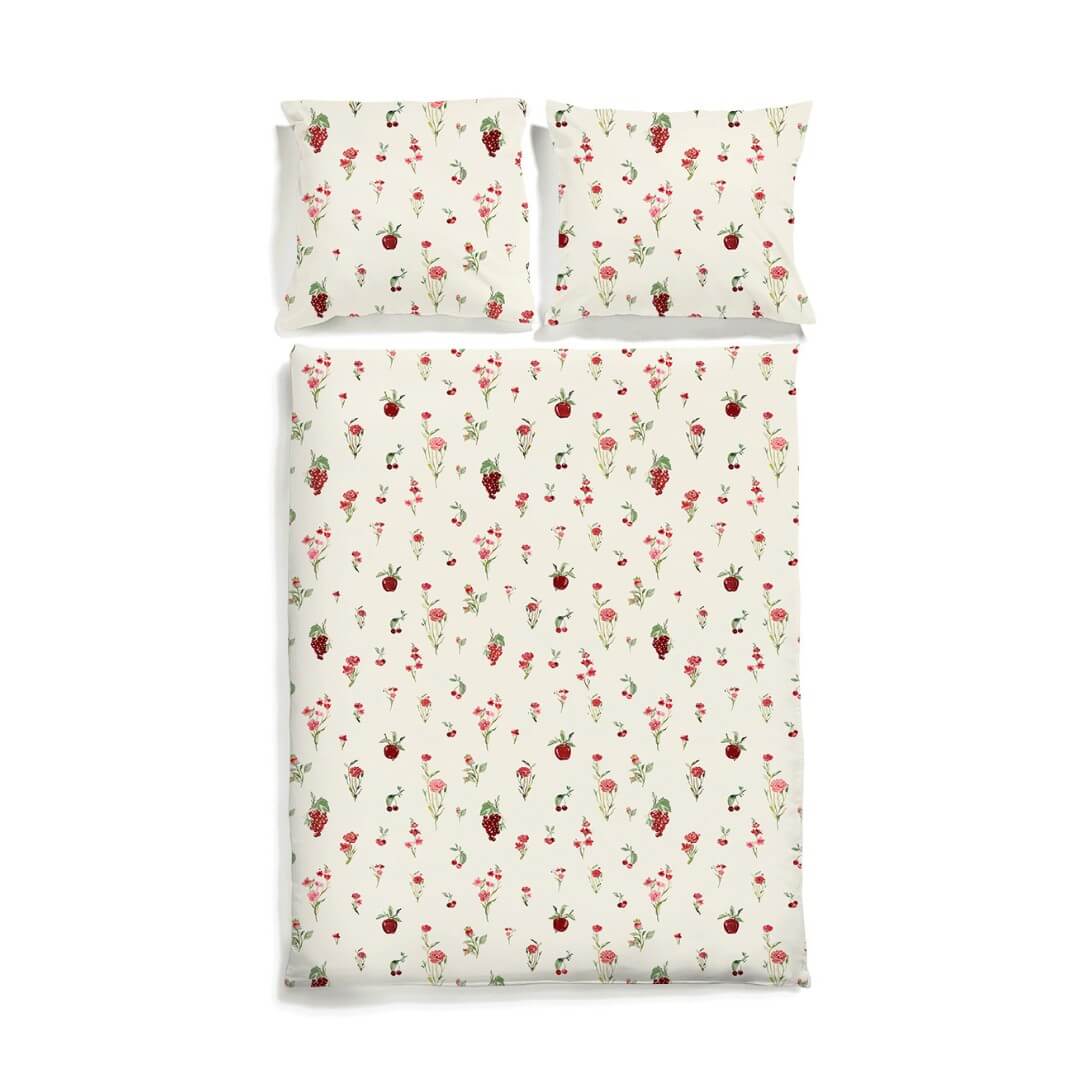 Our bedding set is made from the very soft and breathable cotton sateen. Wild orchard is a beautiful creamy bedding with red fruit and flowers.