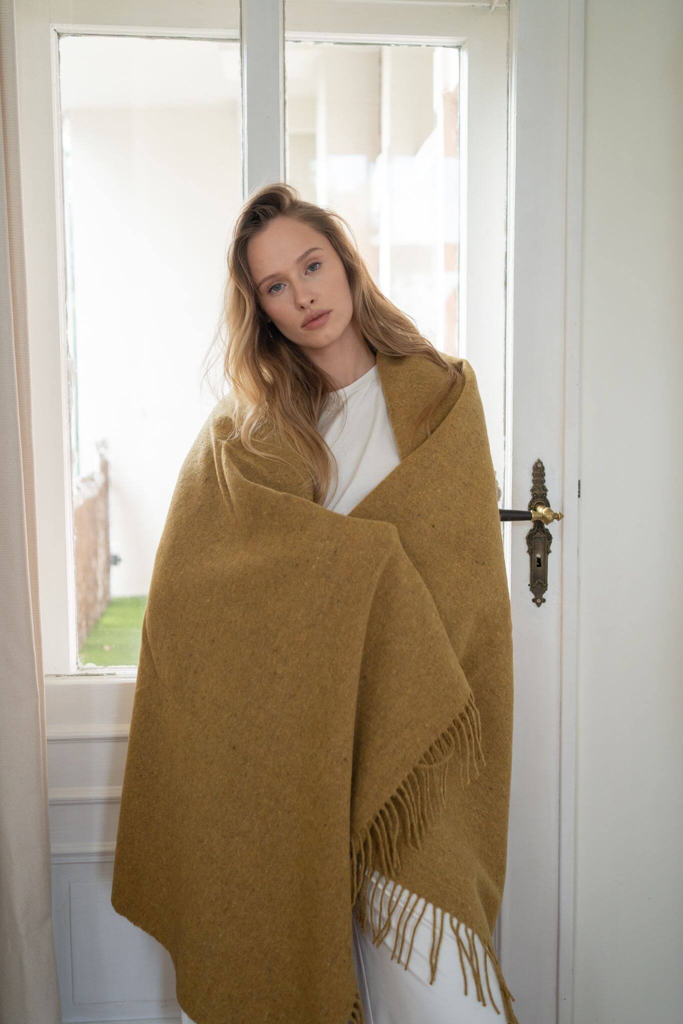 Musztardowy koc z wełny merino o intensywnym, głębokim odcieniu wnosi do wnętrza wyjątkowy, przytulny klimat i subtelny akcent kolorystyczny.
