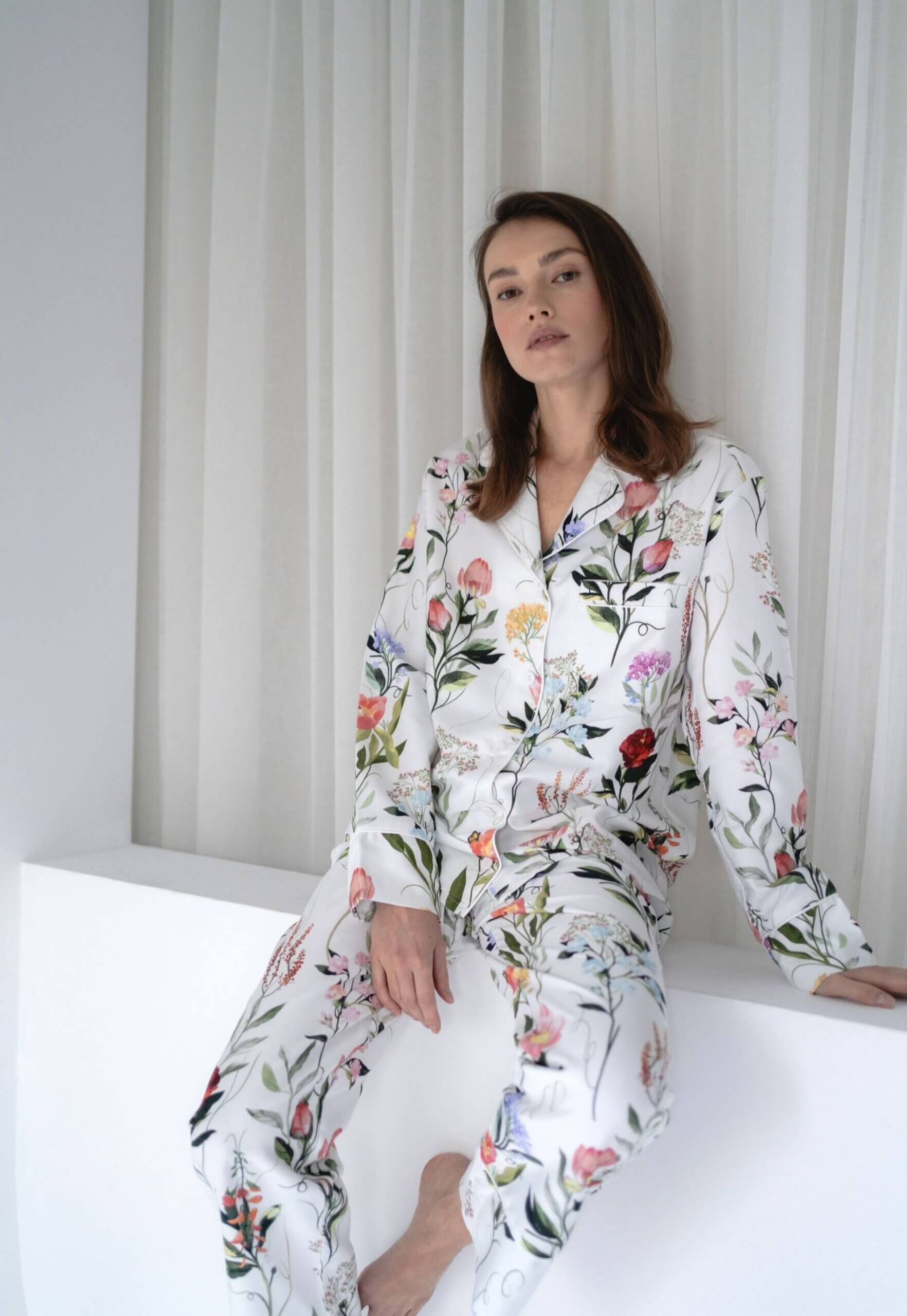Piżama w kwiaty, na którą składają się klasyczna koszula z długim rękawem guzikami, kołnierzykiem i delikatną kieszonką, a także długie spodnie. Całość obszyta ozdobną lamówką. Ta dwuczęściowa piżama damska została uszyta z satyny bawełnianej, materiału, który jest przewiewny, miękki i jedwabny w dotyku, co sprawia, że śpi się w niej bardzo komfortowo.