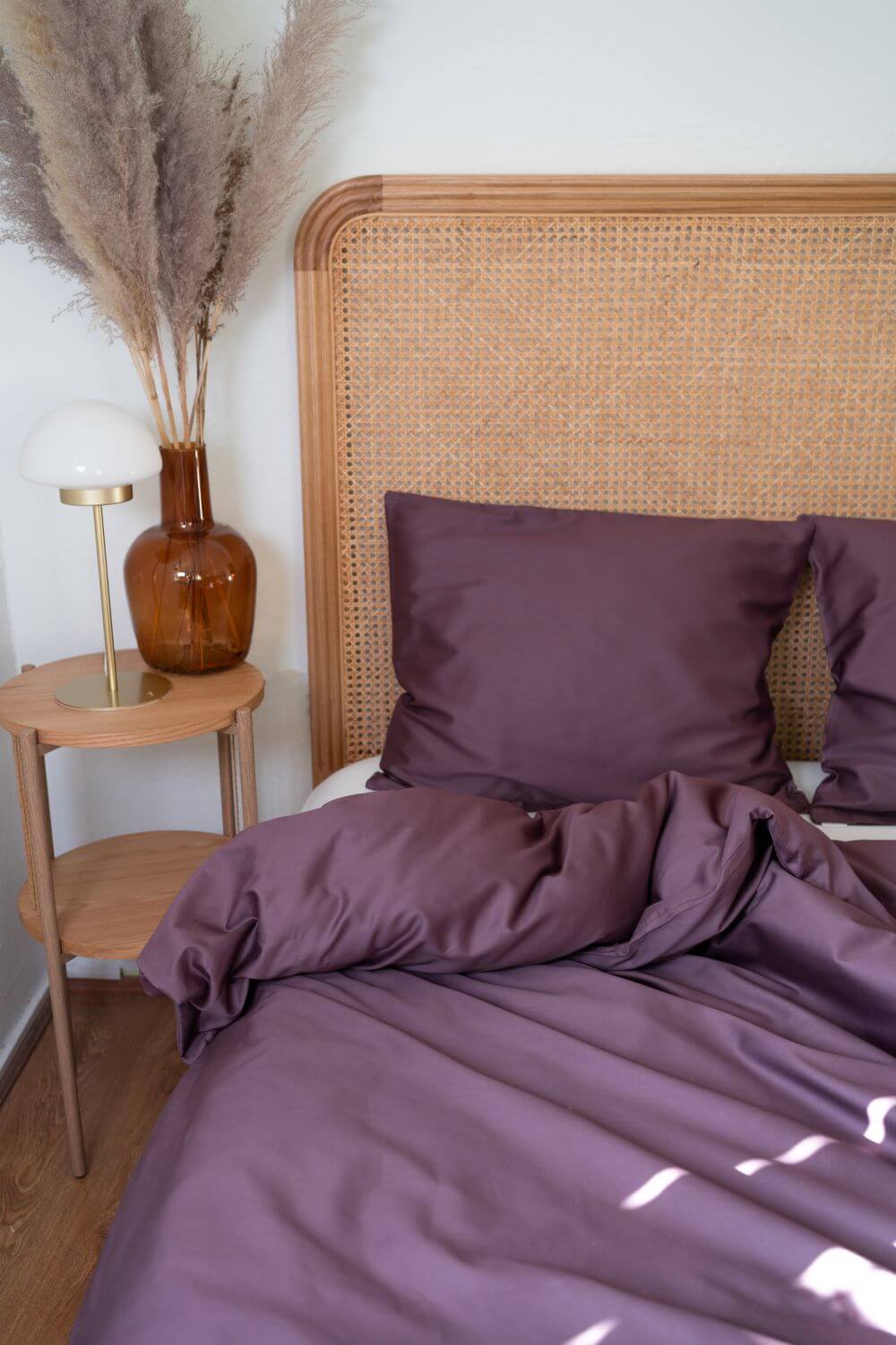 Połącz pościel fioletową z prześcieradłem z satyny bawełnianej w również w kolorze royal purple oraz szarym kocem z wełny merino by stworzyć harmonijny, elegancki zestaw do sypialni.