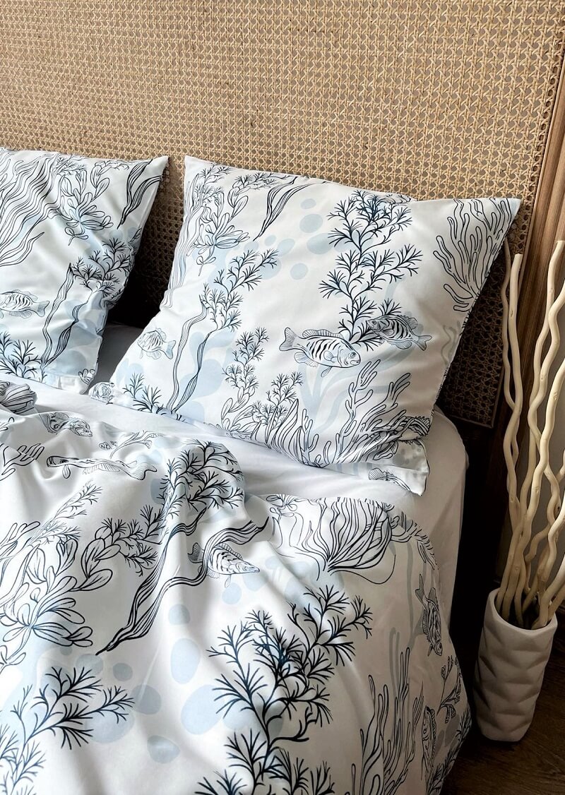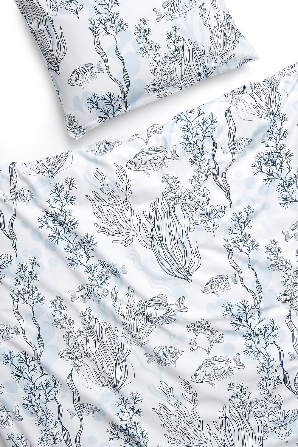 Dwustronna poszewka ze wzorem rybek i podwodnej roślinności.