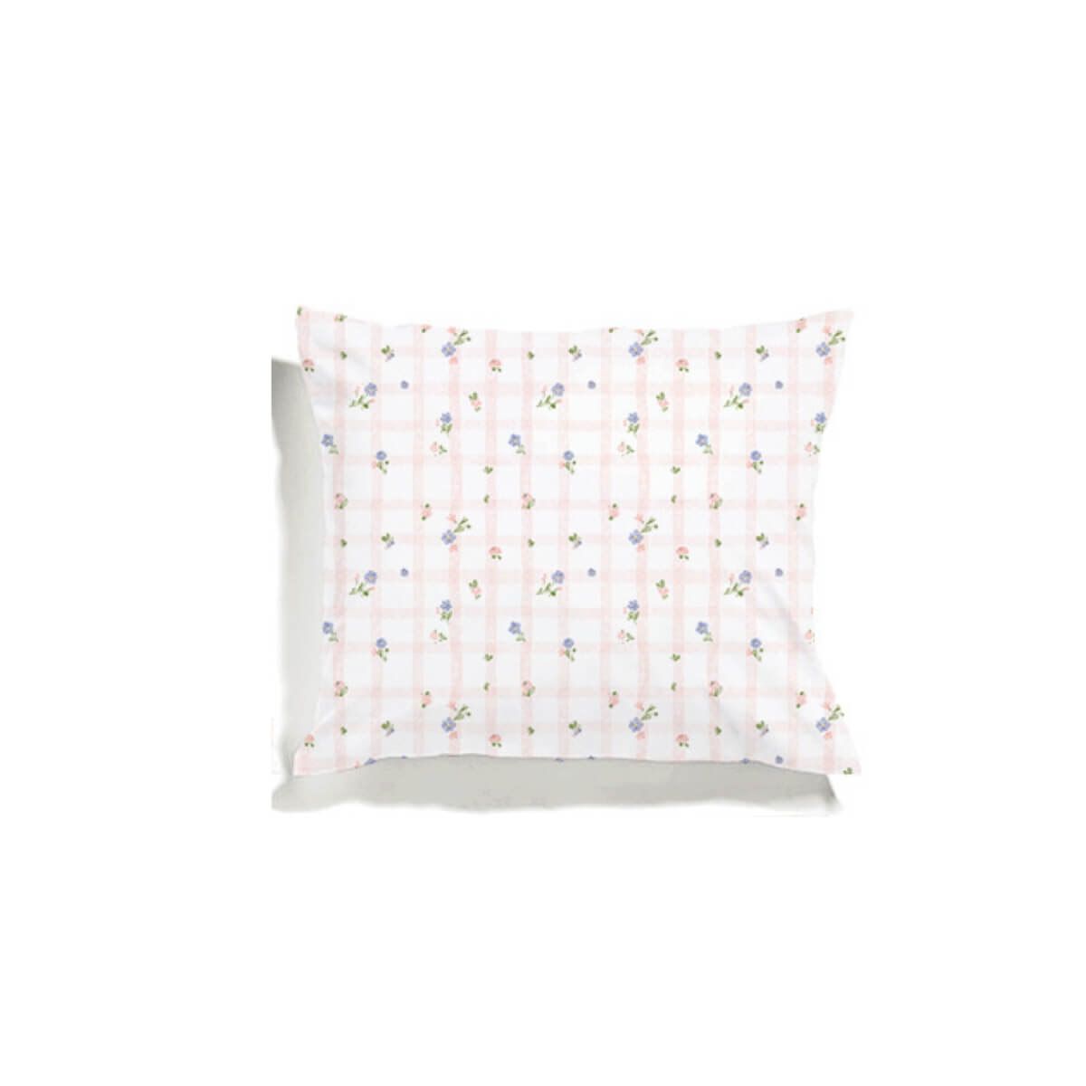 Bawełniana poszewka Sielski poranek w różowo‑pastelową kratkę z drobnymi kwiatuszkami, idealna do kobiecej sypialni i dziewczęcych pokoików.
